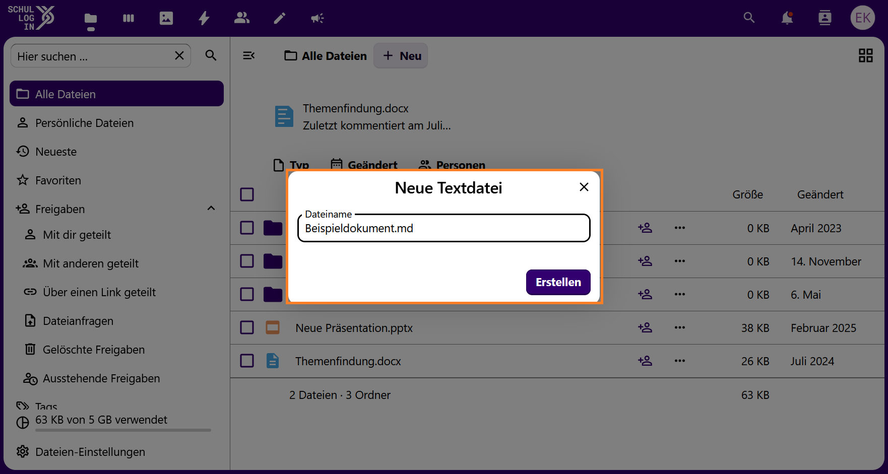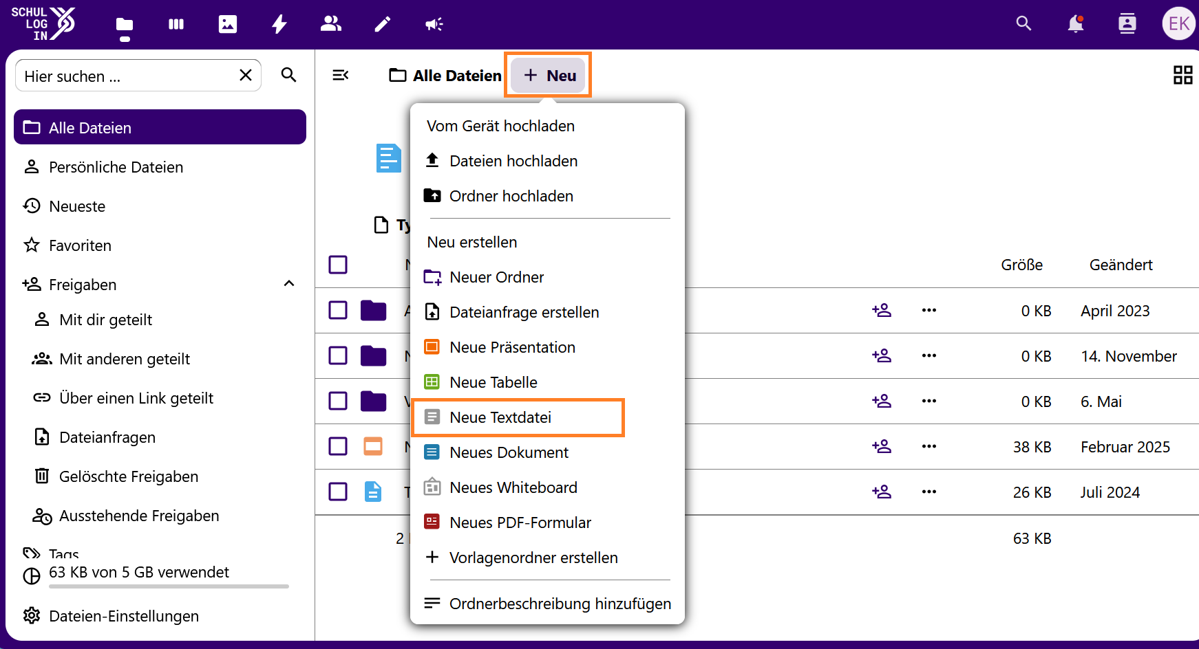 In der Schullogin-Dateiablage haben Sie die Möglichkeit, PDF-Dateien auszufüllen, zu bearbeiten und bspw. eigene Textfelder zu ergänzen. Öffnen Sie dafür eine Datei im Format .pdf und beginnen Sie direkt mit der Bearbeitung oder wählen Sie "PDF bearbeiten" in der oberen Menüleiste. Das Einfügen digitaler Signaturen ist nicht möglich.