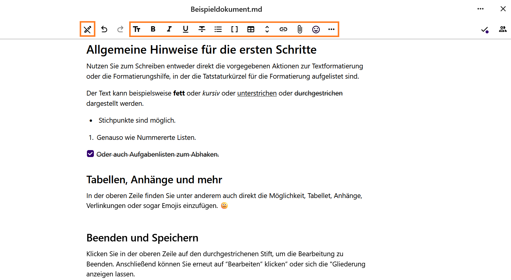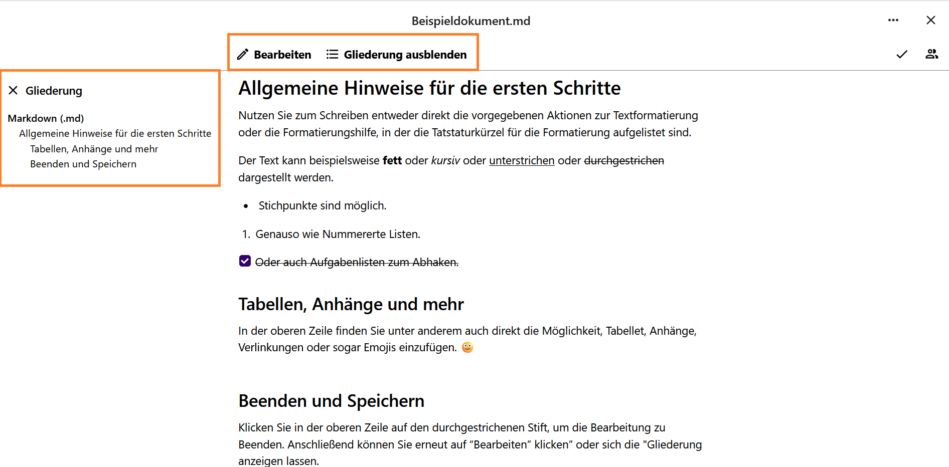 Beenden Sie die Bearbeitung, indem Sie links oben auf den durchgestrichenen Stift klicken. Anschließend können Sie sich die Gliederung anzeigen lassen oder das Dokument weiter bearbeiten.