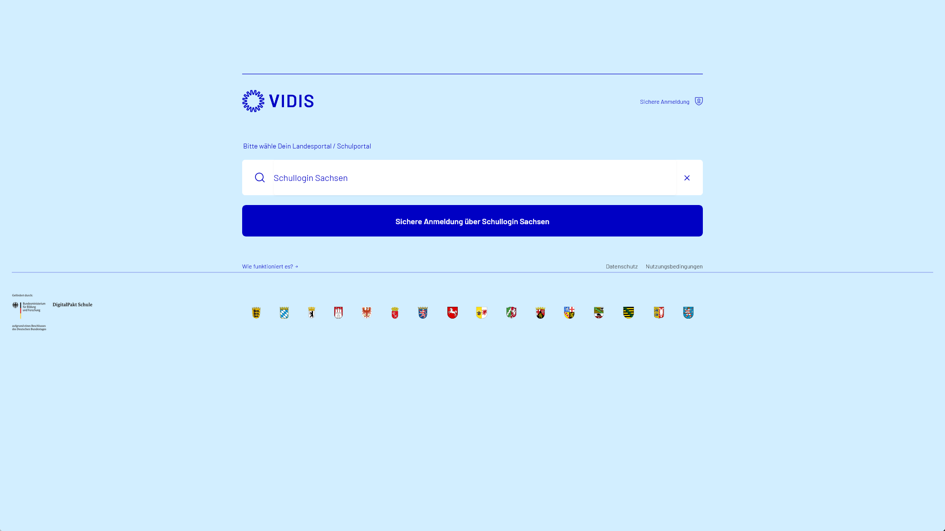 Verbinden Sie sich mit der VIDIS-Schnittstelle via „Schullogin Sachsen“ und bestätigen Sie dies mit einem Klick auf die blaue Schaltfläche.